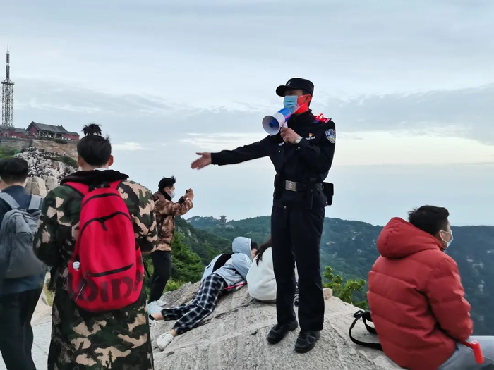 2010年2月12日,农历除夕前一天,张连波成为岱顶派出所第11任所长。如今,年近50的他是日头的老熟人了,他知道每个时节的日出时刻:5月中旬到7月下旬,太阳在凌晨4点多就探了头,他和同事要赶在游客登顶前,守护在各个观日出的点位,提着小喇叭,提醒游客“注意脚下安全”“照顾好身边的老人和小孩”“保管好随身物品”“不要扎堆、聚集”。