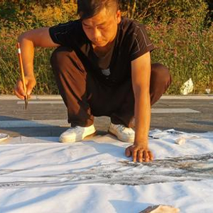 长时间室外作画,伤眼睛,他的左眼总是半眯着,握住毛笔的手裹着一层汗,指甲缝里窜进些许墨汁,黝黑的皮肤被晒脱皮,胳膊上留下粉色的疤痕,续起的长发扎着马尾。
