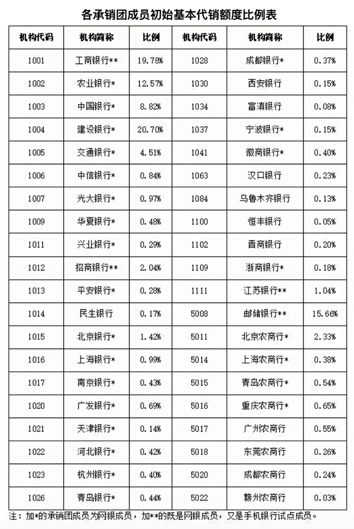 从承销团成员代销的额度来看,建行、工行、邮储银行代销额度比例位列前三,分别为20.7%、19.78%、15.66%。