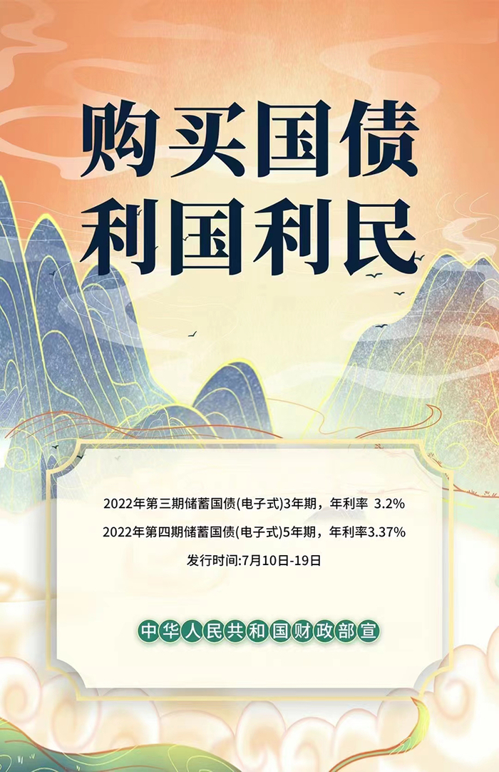 根据财政部公告,2022年第三期、第四期储蓄国债(电子式)将于7月10日至7月19日发售。