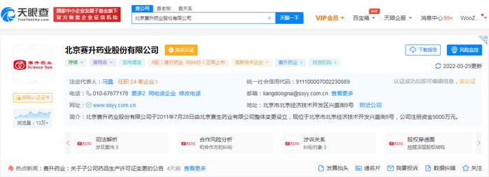 天眼查数据显示,赛升药业成立于1999年5月,2011年7月由北京赛生药业有限公司改制更名为北京赛升药业股份有限公司;后于2015年6月成功登陆深交所。公司是北京市专利示范单位、生物医药产业跨越发展(G20工程)行业领军企业、北京市企业技术中心、北京市诚信创建企业、智能制造试点示范企业、中国医药百强企业,并设有博士后工作站。目前,赛升药业已初步形成基于研发创新平台、医药产业链创新平台、协作技术创新平台和资本产业平台四大战略平台的集团化发展路径。