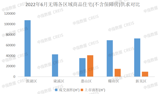 2022年6月,滨湖区新房成交最多,成交10.75万㎡,惠山区上市面积最高,新增4.1万㎡。