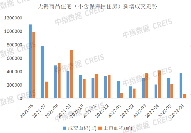 2022年6月,无锡市商品住宅(不含保障性住房)新增供应6.5万㎡,同比下跌93.39%,环比下跌70.15%;成交面积为38.4万㎡,同比下跌65.17%,环比上涨27.08%;成交金额约92.8亿元,同比下跌63.92%,环比上涨27.44%。