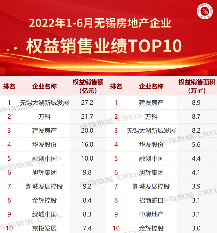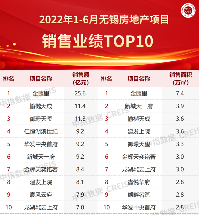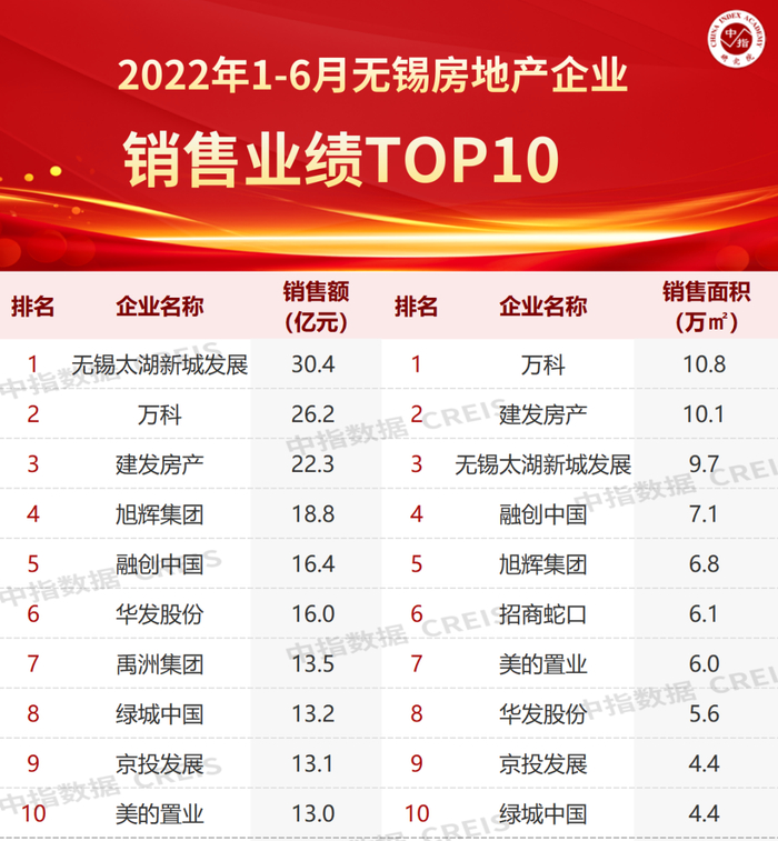 特别声明:房地产企业销售数据统计是以2021年1月1日-6月30日期间销售的商品房为统计口径,主要依据中指数据CREIS(点击试用)在无锡市区(不含江阴、宜兴)的销售监测数据,并参考当期总体经营情况和推盘去化情况进行分析统计;对于少数没有在监测范围内的项目,由企业提供相关证明文件,经课题组对数据进行严格审核,也纳入统计范围。本报告仅供参考,课题组不对使用报告及其内容所引发的任何直接或间接损失承担责任。