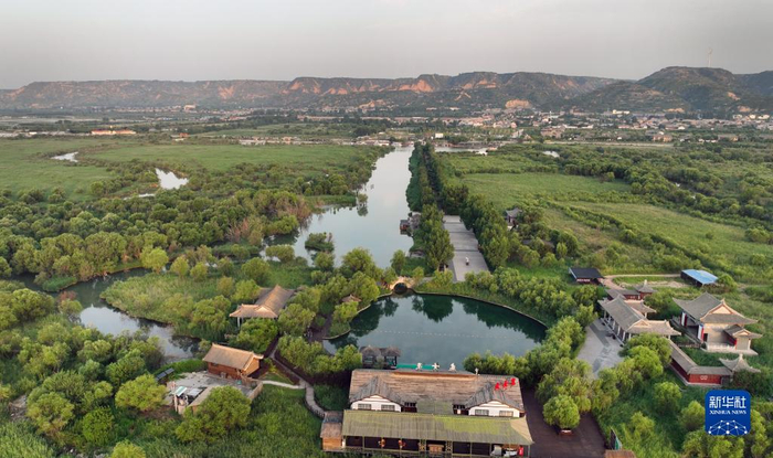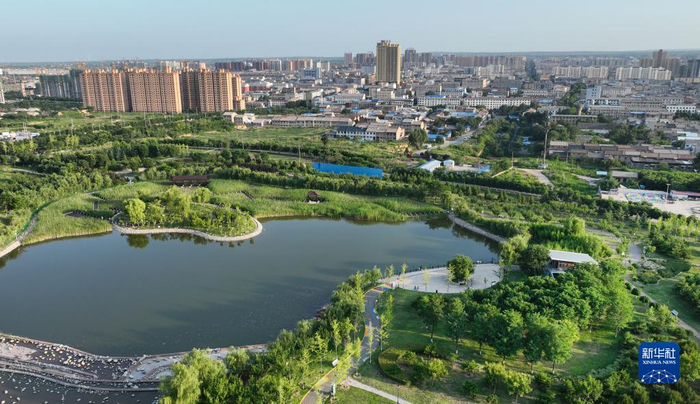 合阳县城九龙湿地公园景色(7月8日摄,无人机照片)。