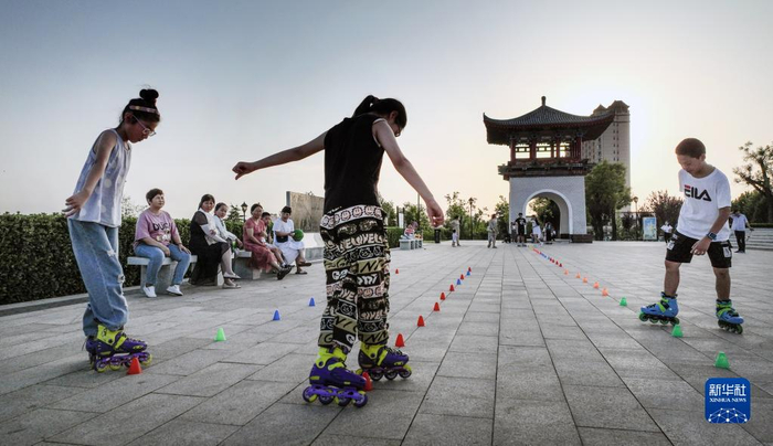 7月8日,小朋友在合阳县街心公园游玩。