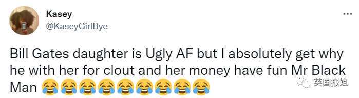 “比尔盖茨的女儿太特么丑了,我完全能理解这个黑人兄弟为了她的名声、钱和她在一起,玩得开心啊,黑人先生。”