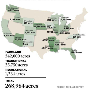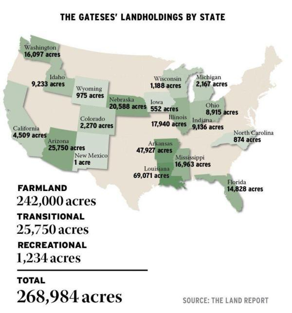实际上,这并不是盖茨第一次在美国投资买地。2021年的《100号土地报告》(这是对美国最大的土地所有者进行的年度调查)显示,盖茨被认为是美国最大的农田私有者,在数十个州拥有约269000英亩(108860公顷)的农田,不到全美国总耕地的1%。