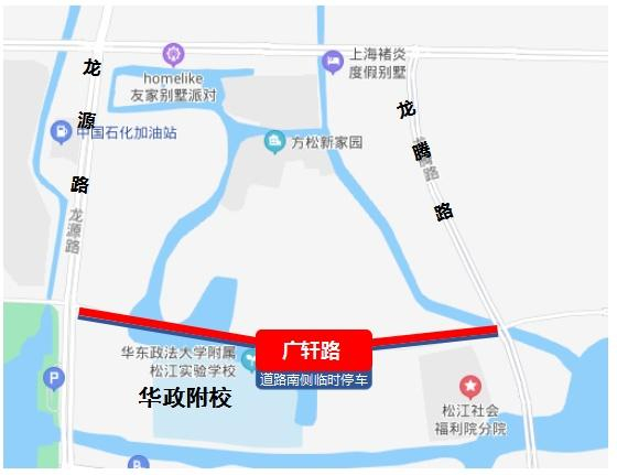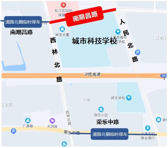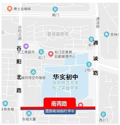 同时,为方便家长接送考生,松江交警在考点周边设置了临时停车区域(下图蓝色表示),请家长根据现场指示牌标示,听从现场民警指挥,有序停放车辆。