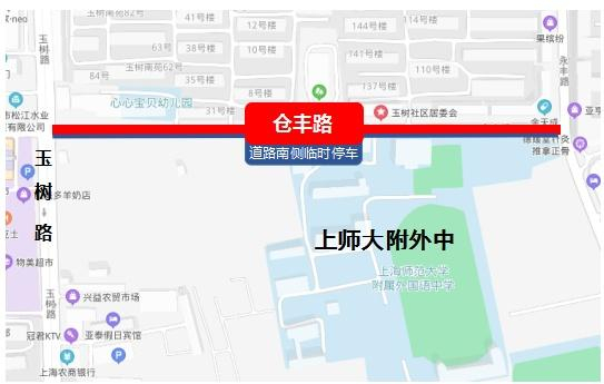 仓丰路(玉树路—永丰路)考试期间社会车辆实施西向东单向通行,听力考试期间禁止社会车辆通行,上述路段道路南侧可临时停车