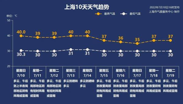 今年的高温来得早,起点也高。或许,下一周我们还将见证历史。预报显示,上海未来几天副热带高压依旧强大且稳定,各种能降温的因素,都被挡在门外,高温“坚如磐石”,酷热高温天气持续。每一天都是火热又滚烫,7月11日至14日,极端最高仍可达40℃。明天上海中考即将开考,明后天最高气温仍将达39℃,大家一定要做好防暑降温,适当准备清凉物品。