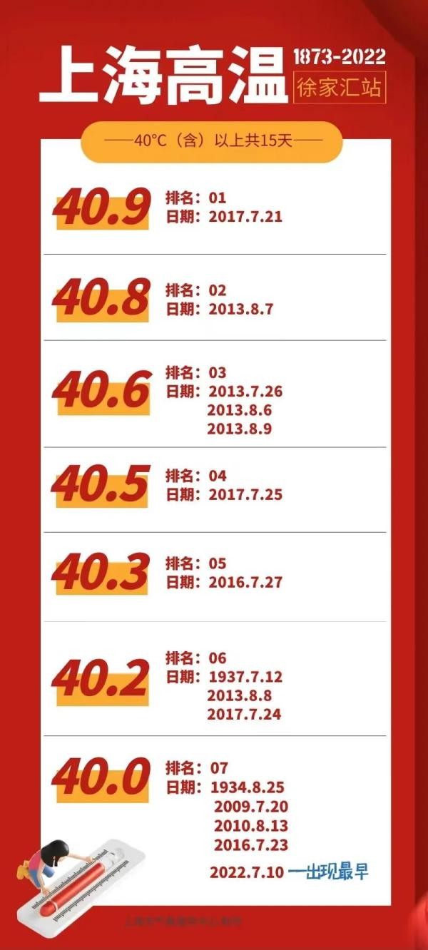 自有气象记录以来,上海总共出现了15个40℃以上的极端酷热天气,其中1934年2天、2009年1天、2010年1天、2013年5天、2016年2天,2017年3天。2017年的40.9℃刷新历史纪录。