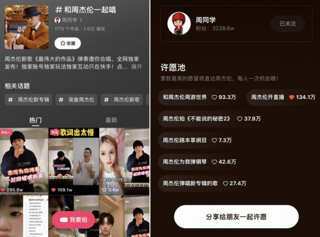短短一天时间,#和周杰伦一起唱#活动播放量已经突破2.6亿,让网友忍不住感叹“我周董不愧是我周董啊,这个号召力也没谁了。”还有网友隔空喊话“周老师快出来评作业吧,大家都交了。” 上线5天的快手许愿池,目前已有超340万的网友进行许愿,其中有超130万人在快手许愿周杰伦开直播,而期待“和周杰伦周游世界”“周杰伦为我弹钢琴”以及“周杰伦拍《不能说的秘密2》”都为热门愿望。目前周杰伦本人已经发布弹钢琴合拍视频,直播也已官宣,看来《周游记》第二季也是可以期待一把的!
