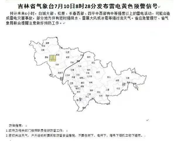 吉林省气象台7月10日8时28分发布雷电黄色预警信号:预计未来6小时,白城大部、松原、长春西部、四平中西部有中等强度以上的雷电活动,可能会造成雷电灾害事故,部分地方伴有短时强降水、雷暴大风或冰雹等强对流天气。