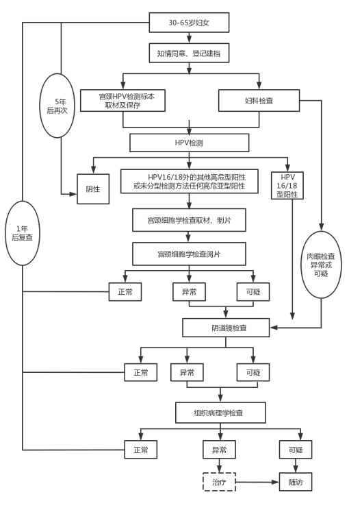 宫颈癌筛查异常可疑病例主要包括:宫颈癌细胞学检查TBS报告结果为未明确意义的不典型鳞状上皮细胞(以下简称ASC-US)及以上者、高危型HPV检测结果阳性者、肉眼检查异常或可疑者、阴道镜检查异常或可疑者以及组织病理学检查结果为宫颈高级别病变及以上者。对宫颈癌筛查异常或可疑病例进行追踪随访,督促其尽早接受进一步诊断及治疗,并及时记录病例相关情况。