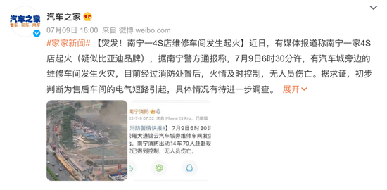 7月9日清晨6时许,广西南宁市兴宁区秀厢大道边突然冒出滚滚浓烟,原来是一家4S店内发生了火灾。据网传视频显示,浓烟从比亚迪正亚秀厢1号店后方升起,多辆消防车在该店前开展灭火作业。