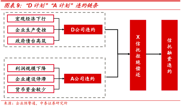 D公司于2017年10月委托Z信托募集信托资金3亿元,并以Z信托的名义受让D公司现已拥有的对D市政府价值不高于3.8亿元的应收账款债权,简称“D计划”。2020年,由于疫情对当地经济造成了巨大的负面影响,加之D市政府自身债台高筑,企业生产活力不足,D公司未能如期偿还相关款项。2018年2月,A公司委托Z信托募集信托资金3亿元,简称“A计划”。2020年A政府未与A公司进行工程结算,导致公司收入以及利润规模大幅下降,未能实现委托代建收入;同时,公司资产中的货币资金规模小,再加上疫情的影响,A公司现金流不足以偿还债务。而截至2020年末,X信托所需偿还的信托项目数目达到近30项,每项款项数额为1-2亿元,总计还款额巨大。X信托最后选择拒绝按照协议兑现原Z信托承诺,“D计划”“A计划”等一系列信托融资的后续尾款均未能得到偿付。