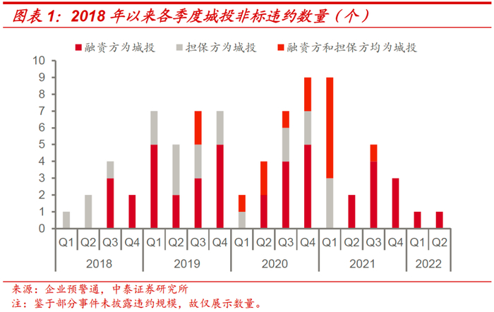 2018-2021年,城投非标违约数量分别为9、26、22和19个,2022年上半年城投产品年违约数量较少,仅2个。从披露时间来看,每年三、四季度披露违约数量相对较多。从主体性质来看,2019年融资方为城投公司的产品违约数量最多达到15个。