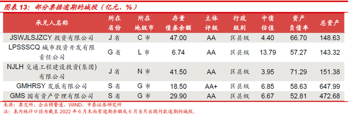 3)关注区域城投及其关联主体商票逾期事件。票交所自2021年8月起披露出现3次以上付款逾期的主体名单。2022年上半年出现3次以上付款逾期且截至6月末尚有逾期余额或6月当月出现付款逾期的承兑人数量为2667家,其中5家为城投主体,均为区县级城投,其中2家城投存量债余额超过40亿元。