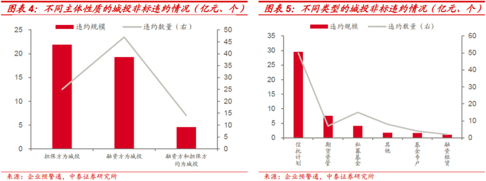 分主体性质来看,融资方、担保方均为城投的非标产品合计违约规模和数量较少,披露规模合计4.57亿元,披露数量合计14个;担保方为城投的非标产品合计违约规模和数量较多,披露规模合计21.90亿元,披露数量合计25个。分产品类型来看,信托计划违约规模和数量较大,披露规模合计29.55亿元,披露数量合计50个;融资租赁、基金专户的违约事件相对较少,披露规模合计分别为1.06亿元、1.68亿元。
