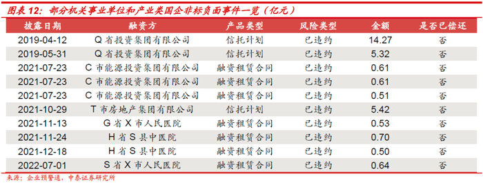 2)关注区域内机关事业单位和产业类国企的非标违约事件。机关事业单位与当地政府关系较为紧密,部分产业类国企由城投转型而来或承接当地重要产业,此类主体如有非标违约,一定程度上意味着区域协调金融资源能力较弱,可视为风险信号,以下我们梳理了部分所涉金额在0.5亿元以上的机关事业单位和产业类国企非标负面事件。