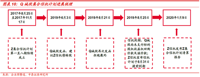 融资方Q城投定位是履行政府授权范围内的城建资产投资主体职能。担保方G城投是Q城投的100%持股股东。两家主体均为Q州地市级发债平台。Z集合信托计划由Z信托作为管理人于2017年发行,共八期,规模2.65亿元。2019年8月,信托计划第1期到期,Q城投未按约定支付标的股权收益权回购价款及溢价款,构成违约。截至2019年9月,G城投未履行任何义务。2019年期间,6月Q城投曾发函建议Z信托债转股;8月Q城投再次发函拒绝履约。此次违约事件系Q州部分下辖县过度举债、债务规模较高,而Q城投对区域内多个下辖县都提供了担保且金额较大,从而被拖累。其中D县不顾每年财政收入不足10亿元的实际,盲目高额举债,债务曾高达400多亿元,绝大多数债务融资成本超过10%;S县政府债务余额也曾达到将近100亿元。