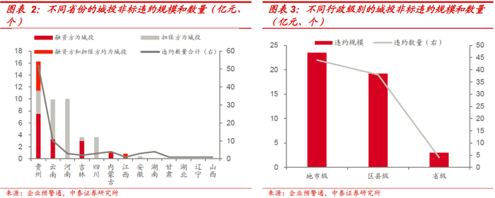 分省份来看,贵州、云南、河南所涉非标违约规模和数量较大,披露违约数量分别为52个、10个、3个,披露违约金额分别为16.25亿元、9.93亿元、10亿元。分行政级别来看,地市级违约规模和数量较多,披露违约规模合计23.53亿元,披露违约数量44个;省级违约事件较少且规模较小,披露规模仅3亿元。