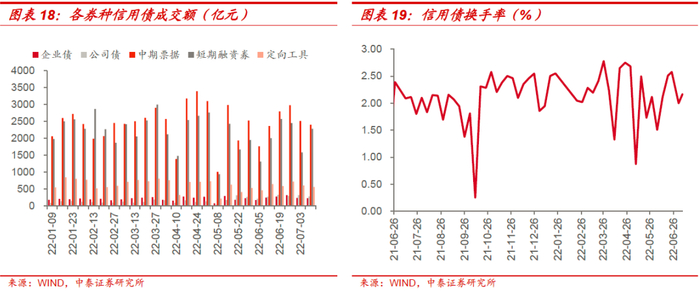 本周信用债市场成交活跃度略有上升。本周信用债周度换手率为2.17%,较上周上升0.17个百分点。分券种看,企业债、公司债、中期票据、短期融资券和定向工具成交量分别为229.01亿元、277.36亿元、2398.88亿元、2281.64亿元和560.15亿元,短期融资券成交量较上周大幅上升,其它各券种成交量较上周均有一定程度下降。