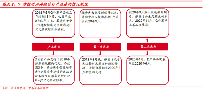 违约非标产品一是2018年5月底成立的G私募产品,存续期18个月、收益率在9.5%/年以上。G私募产品应于2019年12月到期,融资方因短期流动性不足未能足额兑付本息形成逾期。第一次展期原定于2020年9月偿付全部本息,但展期后并未按时支付本息。根据公告,G产品在2020年11月决定再次展期。违约非标产品二是2016年发行的D资管产品,存续期3年。融资方到期仍有大部分款项未予支付,提出展期至2020年2月初。之后该产品再次展期至2020年6月。虽融资方未披露更多原因,但其背后与该地区信用事件频发导致城投再融资和兑付能力、评级螺旋下降不无联系。