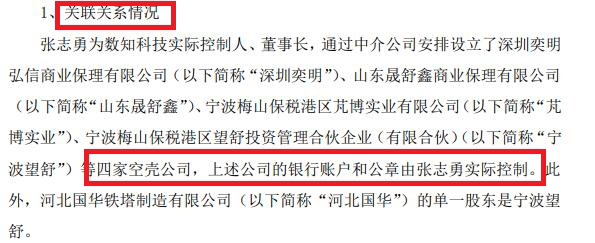 数知科技实际控制人、董事长张志勇,通过中介公司安排设立了四家空壳公司,上述公司的银行账户和公章由张志勇实际控制。此外,空壳公司中的宁波望舒又是河北国华铁塔制造有限公司的单一股东。因此,张志勇是数知科技的关联自然人,河北国华、深圳奕明、山东晟舒鑫、?博实业等四家空壳公司是数知科技的关联法人。但数知科技未如实披露上述情况。