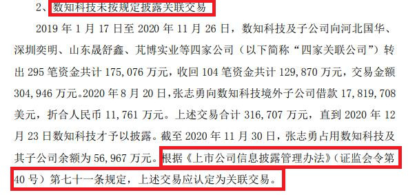 2020年8月20日,张志勇向数知科技境外子公司借款17,819,708 美元,折合人民币 11,761 万元。上述交易合计 316,707 万元,直到 2020年12月23日数知科技才予以披露。