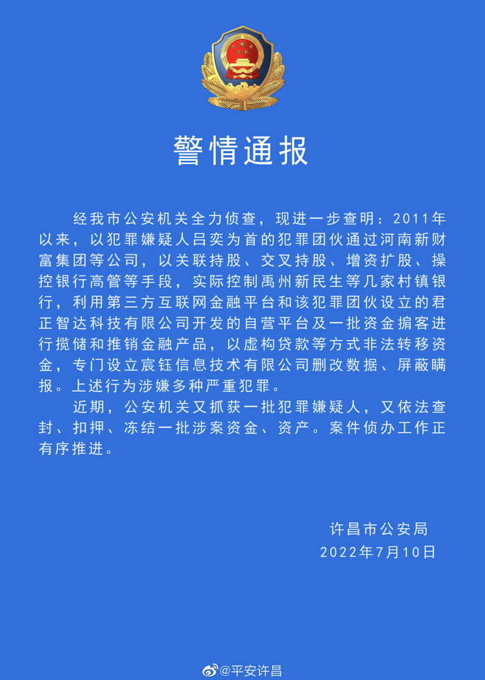 7月10日,即储户与警方、不明人士发生冲突的当天,许昌市公安局再发通报:自2011年以来,以犯罪嫌疑人吕奕为首的犯罪团伙通过河南新财富集团等公司,以关联持股、交叉持股、增资扩股、操控银行高管等手段,实际控制禹州新民生等几家村镇银行,利用第三方互联网金融平台和该犯罪团伙设立的君正智达科技有限公司开发的自营平台及一批资金掮客进行揽储和推销金融产品,以虚构贷款等方式非法转移资金,专门设立宸钰信息技术有限公司删改数据、屏蔽瞒报。上述行为涉嫌多种严重犯罪。