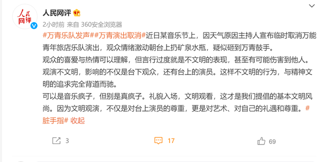 人民网评万青乐队演出取消观众现不文明行为:可以是音乐疯子,但别是真疯子