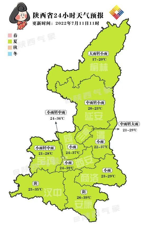 全省阴天,陕北大部、关中部分地方、陕南部分地方有阵雨或雷阵雨,榆林西部部分地方、延安大部、宝鸡西部、汉中西部有大雨,局地有暴雨。陕南东部局地最高温度 35-37℃。