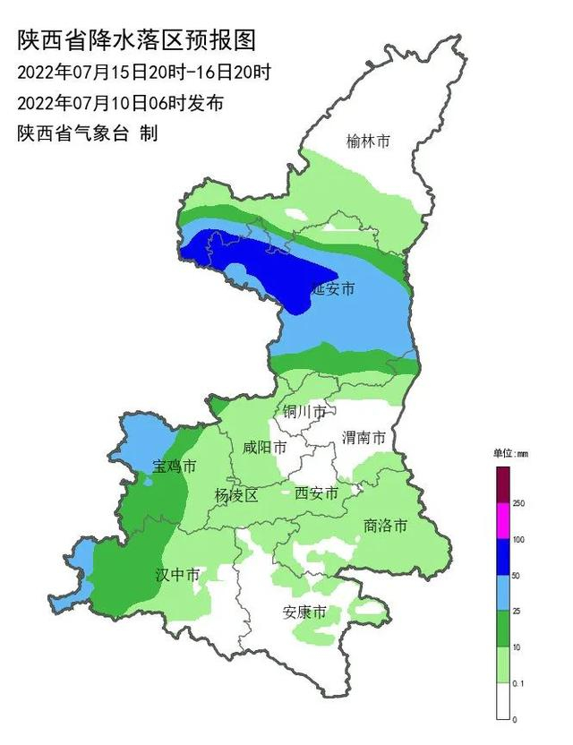 目前榆林市南部部分县区、延安市北部部分县区降水量已达50毫米以上且降雨将持续,预计下述地区未来6小时内降雨量将达50毫米以上:铜川市