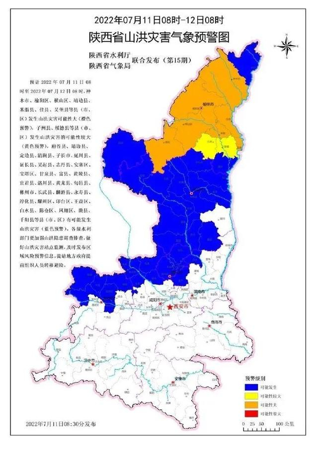 预计2022年07月11日08时至2022年07月12日08时,神木市、榆阳区、横山区、靖边县、米脂县、佳县、吴堡县等县(市、区)发生山洪灾害可能性大(橙色预警),子洲县、绥德县等县(市、区)发生山洪灾害的可能性较大(黄色预警),府谷县、靖边县、定边县、清涧县、子长市、延川县、延长县、吴起县、志丹县、安塞区、宝塔区、甘泉县、富县、黄陵县、宜君县、洛川县、黄龙县、旬邑县、彬州市、长武县、麟游县、永寿县、淳化县、耀州区、印台区、王益区、白水县、陈仓区、凤翔区、陇县、千阳县等县(市、区)有可能发生山洪灾害(蓝色预警)。