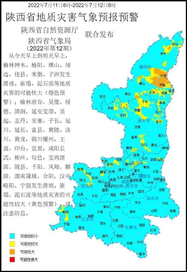 预计2022年7月11日08时至2022年7月12日08时,榆林神木、榆阳、横山、靖边、佳县、米脂、子洲发生滑坡、崩塌、泥石流等地质灾害的可能性大(橙色预警);榆林府谷、吴堡、绥德、清涧,延安宝塔、吴起、志丹、安塞、子长、延川、延长、富县、黄陵、洛川、黄龙,铜川耀州、王益、印台、宜君,咸阳长武、彬州、旬邑,宝鸡渭滨、陇县、千阳、凤翔、麟游,渭南蒲城、合阳,汉中略阳、宁强发生滑坡、崩塌、泥石流等地质灾害的可能性较大(黄色预警),请注意防范。