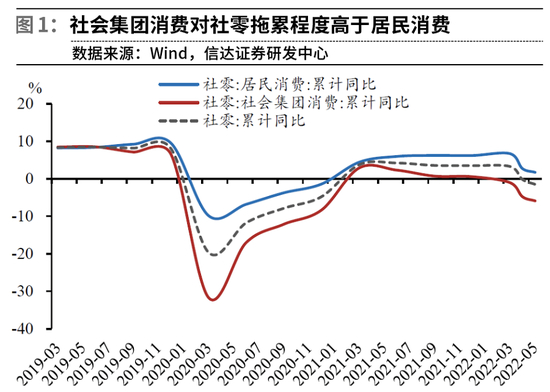 分阶段来看,在疫情之前,2019年社会集团消费的增速要高于居民消费,但是疫情发生以后,伴随大量企业停产停工,企事业单位消费大幅减少,对社会消费品零售总额形成严重拖累,比如2020年3月居民消费和社会集团消费的累计同比分别下降9.84%和31.67%,而社会消费品零售总额累计同比下降19%,拖累程度可见一斑。2020年下半年和2021年随着疫情得到基本控制,社会集团消费增速快速回升,推动社会消费品零售总额水涨船高,但2022年疫情的再次爆发导致疫情区大批企业再次停产停工,企业消费活动受到严重抑制。
