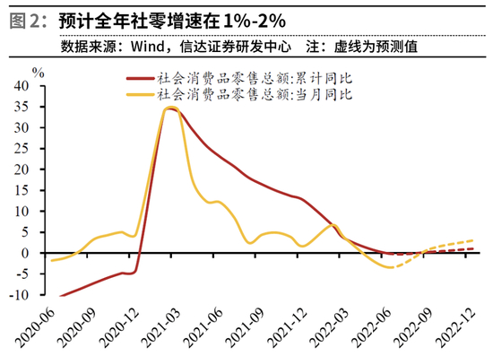 信达证券预计,从7月开始,在没有新一轮疫情下,各地防疫有望逐渐放松,到9月份的社会消费品零售总额累计同比有望实现正增长,到年底实现1%-2%的增长。但以上的推测要建立在下半年疫情结束,促消费政策有效落地的前提下。另外,如果下半年出台重磅增量工具支持基建,消费基础设施的增量可能作为其中一部分被积极拉动,“以投资拉动消费”的效果显著,那么可能推动社零全年累计同比增至2%-3%。