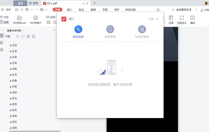 贝壳财经记者在实测中发现,当使用WPS打开涉违规内容PDF文件,并想要采用链接方式分享给别人时,原本可以分享的链接在几十秒到几十分钟不等的时间内显示出了“该文档已被封禁,暂不支持分享”字样,不过该文件的本地文件和云文件并未被删除。