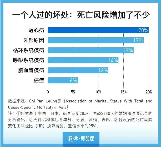 “与已婚人群相比,单身者有着更高的死亡风险和较差的健康状况”。/澎湃新闻数据