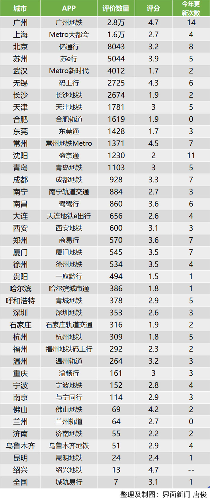 界面新闻根据App Store公开信息,整理出各城地铁APP的评分(满分5分)、评价数量和今年以来的更新次数,一定程度上可以反应它们的实际情况。