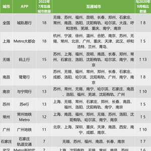 由中国城轨协会牵头成立的城轨易行平台,如今也支持乘坐18个城市的地铁。无锡地铁码上行、南昌地铁鹭鹭行支持的城市为15个,分别增长了13个、8个。南京地铁与宁同行、苏州地铁苏e行、常州地铁Metro等支持的城市也超过了10个。