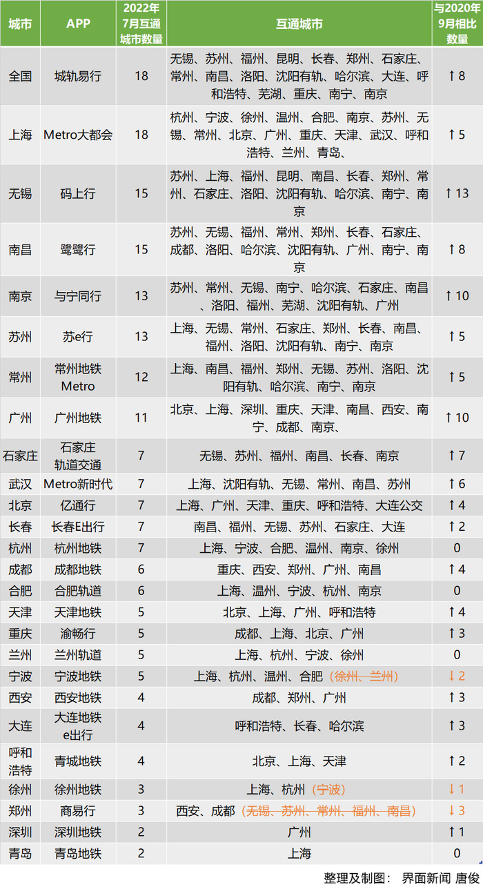 一个意外的现象是,有三个城市地铁的互通数量反而减少了,分别是宁波地铁、徐州地铁和郑州地铁。郑州地铁商易行APP最为明显,此前支持的无锡、苏州、常州、福州和南昌地铁,现在已经不再支持,但增加了成都和西安两地。