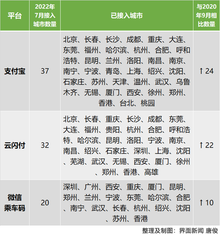基于微信小程序的乘车码,城市拓展最慢。乘车码三年时间仅新开10城地铁,目前支持的城市总数为20个,与支付宝和云闪付有较大的差距。乘车码也是三个平台中,唯一不支持北京和上海地铁的平台。