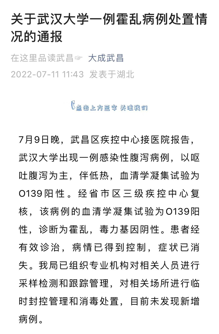 武昌区卫生健康局11日中午发布消息:7月9日晚,武昌区疾控中心接医院报告,武汉大学出现一例感染性腹泻病例,以呕吐腹泻为主,伴低热,血清学凝集试验为O139阳性。经省市区三级疾控中心复核,该病例的血清学凝集试验为O139阳性,诊断为霍乱,毒力基因阴性。患者经有效诊治,病情已得到控制,症状已消失。我局已组织专业机构对相关人员进行采样检测和跟踪管理,对相关场所进行临时封控管理和消毒处置,目前未发现新增病例。