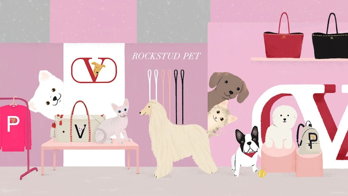 宠物相关的时尚定制服务也日益多元。在Valentino的Rockstud Pet 项目中,Valentino 为宠物主人提供定制服务,可以将主人的姓名首字母和宠物狗或猫的肖像印在定制的 Valentino Garavani Rockstud 宠物包上,费用约为16,500元起。