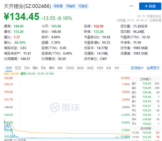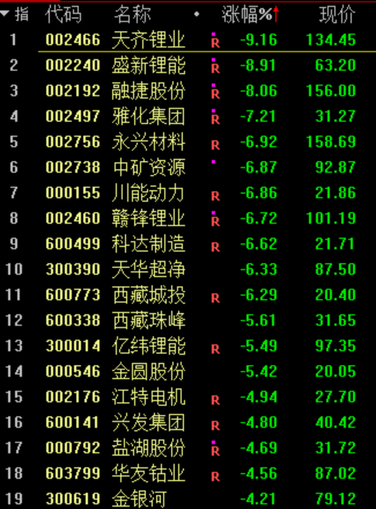 除了天齐锂业一度跌停外。盛新锂能、赣锋锂业、融捷股份等板块概念股集体大跌。