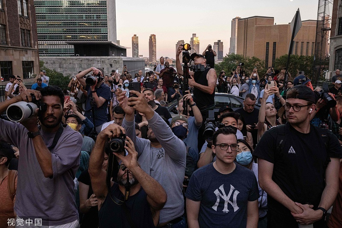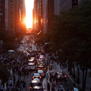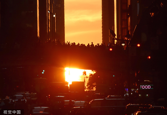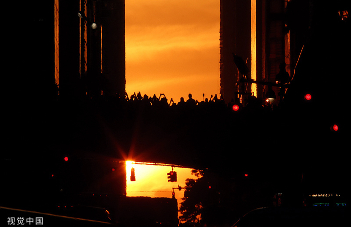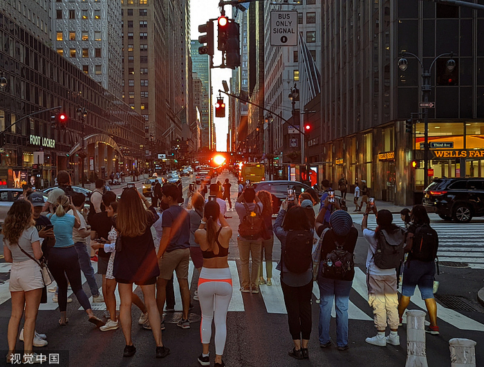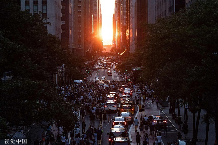 当地时间2022年7月11日,美国纽约曼哈顿,由于曼哈顿街道大多呈棋盘式布局,在每年的5月和7月里的一天,日落时阳光将洒满曼哈顿的所有的东西向街道,呈现一幅壮观的景象,时间长达15分钟。