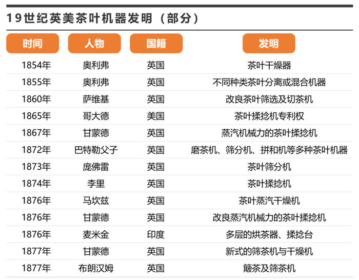到19世纪70年代中期,英国殖民政府领导下的茶叶生产,已经完全实现了机械化和标准化,并不断改进、推广。英国政府对于相关的发明给予专利保护,这极大鼓励了发明和创造的积极性。